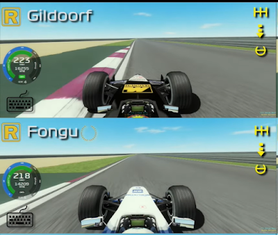 Turn 13 and Gildoorf is carrying more speed, and less downforce, and has to lift, whilst I am able to take it flat. It's not every lap I could take this flat, the exit kerb can pitch you into a spin, or it could compromise you into Turn 14. But with a bit of setup tweaking and practice, I was happy to take it flat. Prblanco and Carl are able to feather off their throttles a little bit.